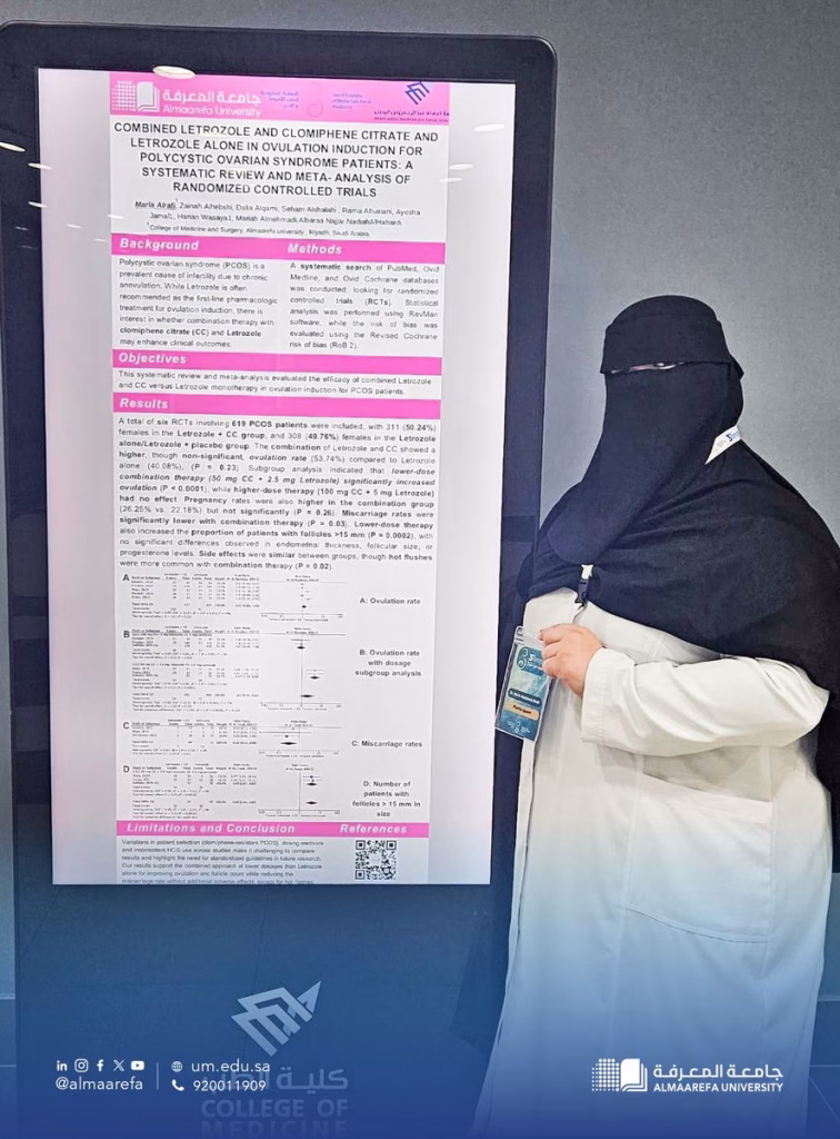 Our medical student Maria Abdulaziz Alrafi, attended and presented her study titled “Comparative Effectiveness of Combined Letrozole and Clomiphene Citrate Versus Letrozole Alone in Ovulation Induction for PCOS Patients” in the field of Obstetrics, Gynecology, and Reproductive… pic.twitter.com/HunnbeTDJx